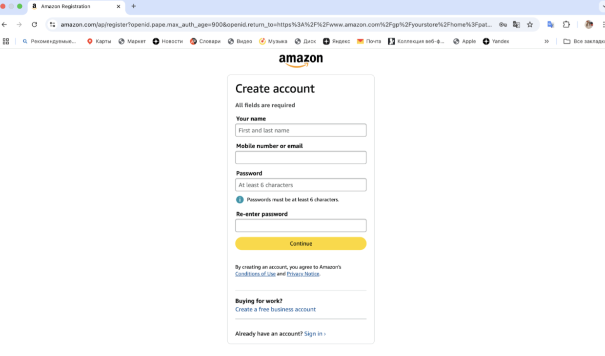 Введите имя, фамилию на латинице. Рекомендуем вводить не номер телефона, так как российские номера могут быть заблокированы для отправки уведомлений, а именно почтовый ящик (также лучше выбирать не российские домены mail и яндекс, а, например, международный gmail). Также нужно придумать пароль и повторить его.