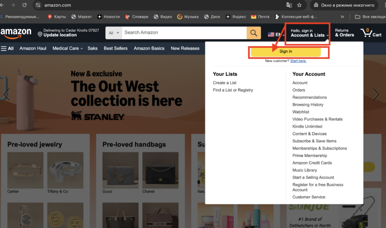 2. В правом верхнем углу страницы наведите на «Hello. Sign In Account&Lists». В появившемся меню кликните на ссылке «Sign here»
